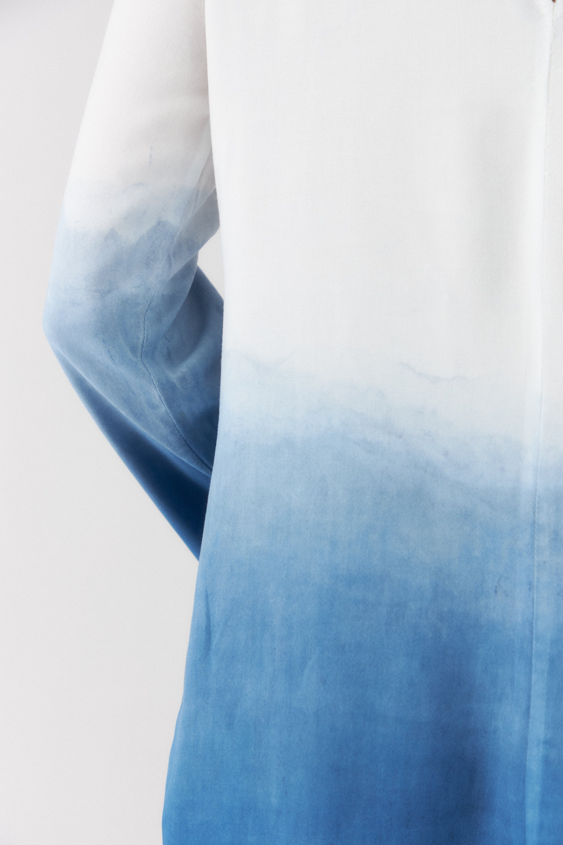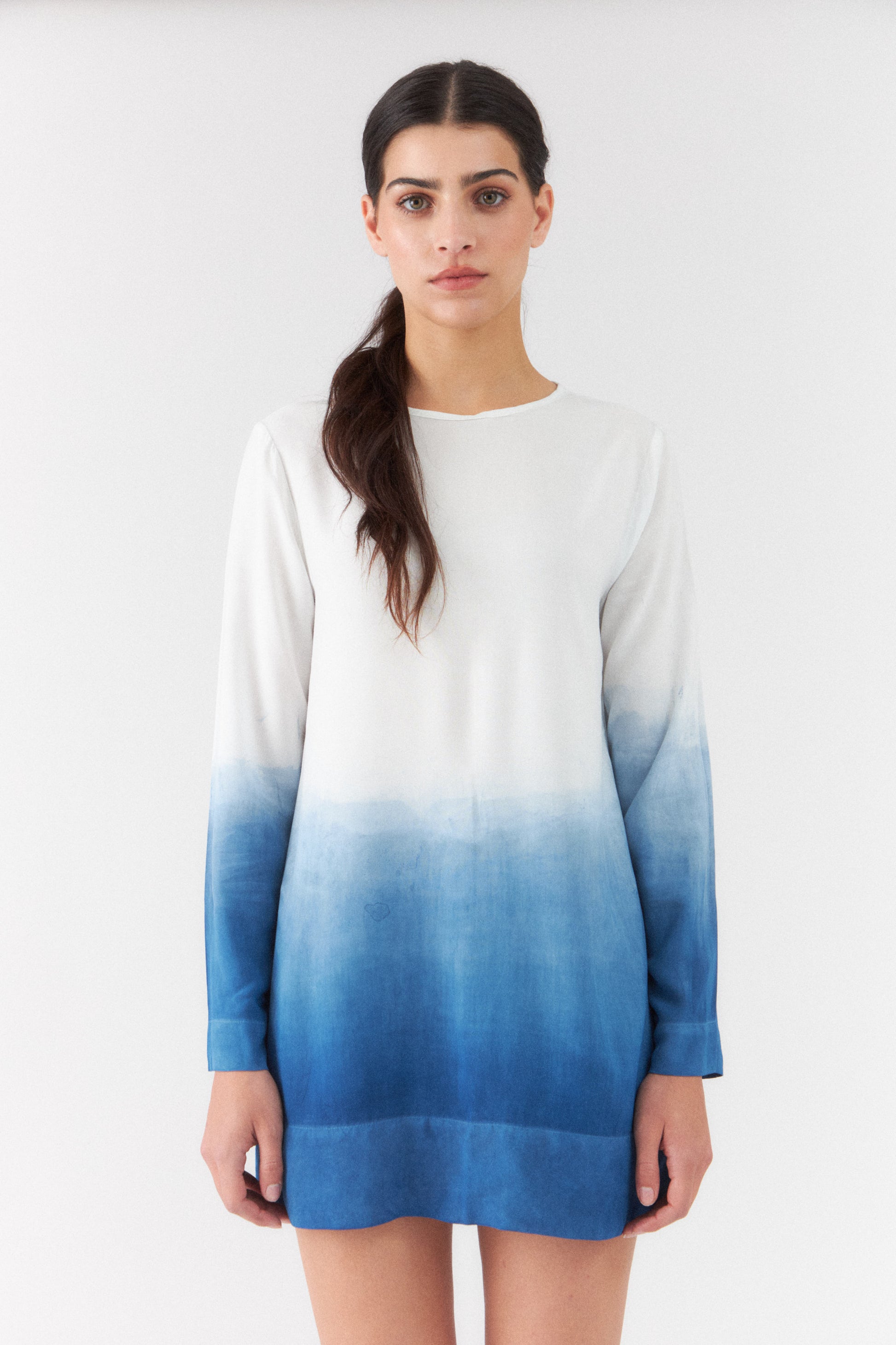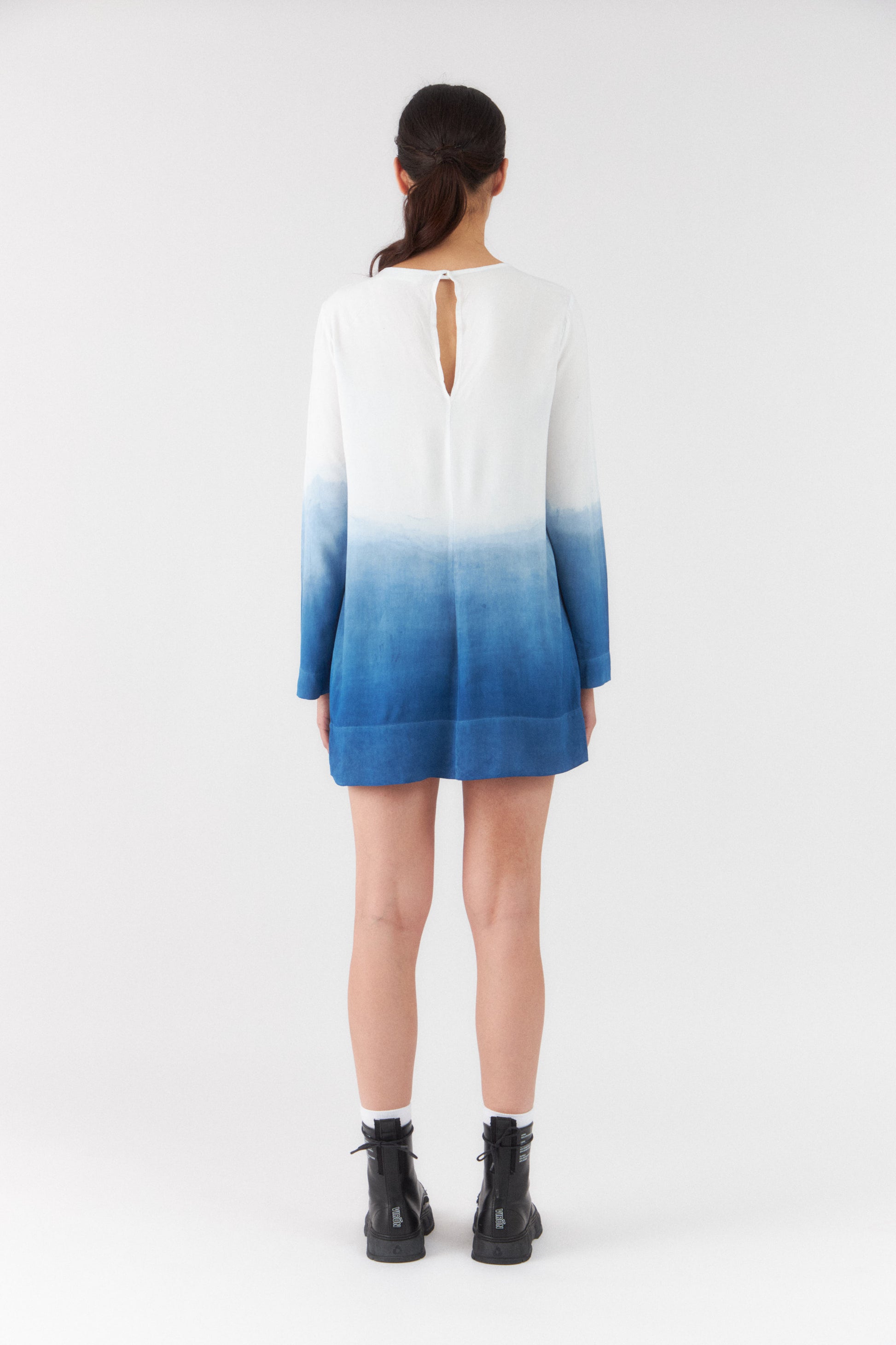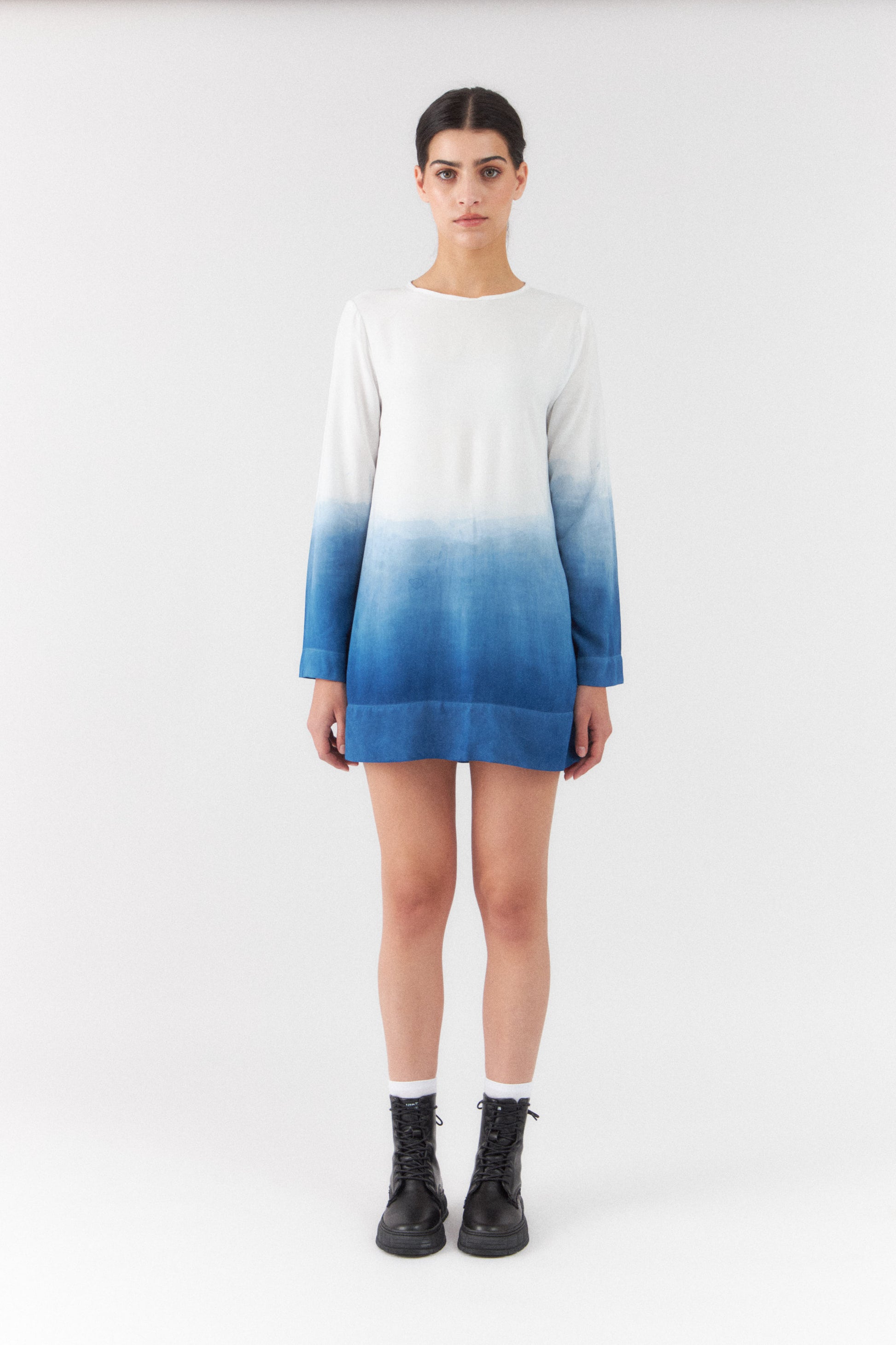 Vestido liviano corto, de manga larga, con cierre posterior con botón. Teñido de forma artesanal resultando en una pieza única. Confeccionado en Uruguay.